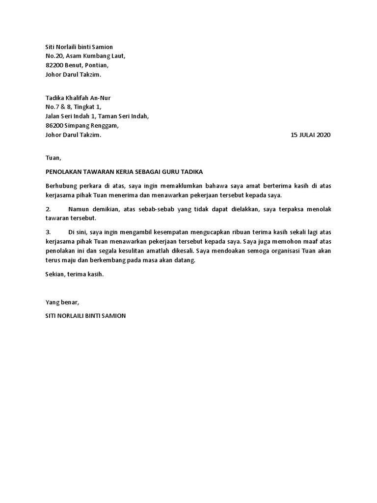 Contoh Surat Sebab Penolakan Tawaran Kerja